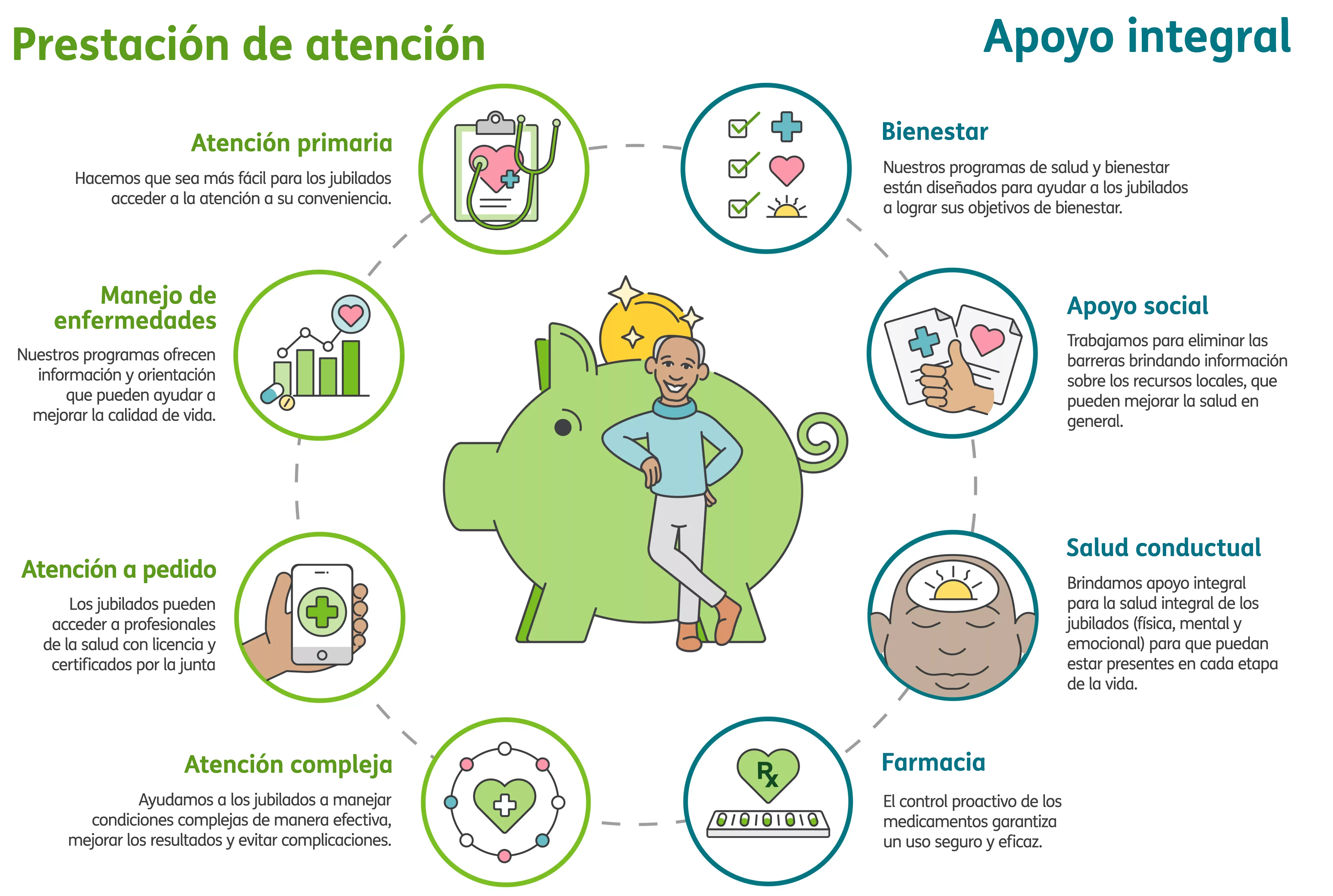 Humana ofrece atención integral a los jubilados. Este enfoque se centra en las necesidades de cuidado de la salud, mientras que aborda las necesidades físicas, conductuales, cognitivas, sociales y financieras del jubilado.